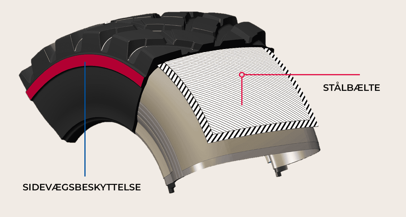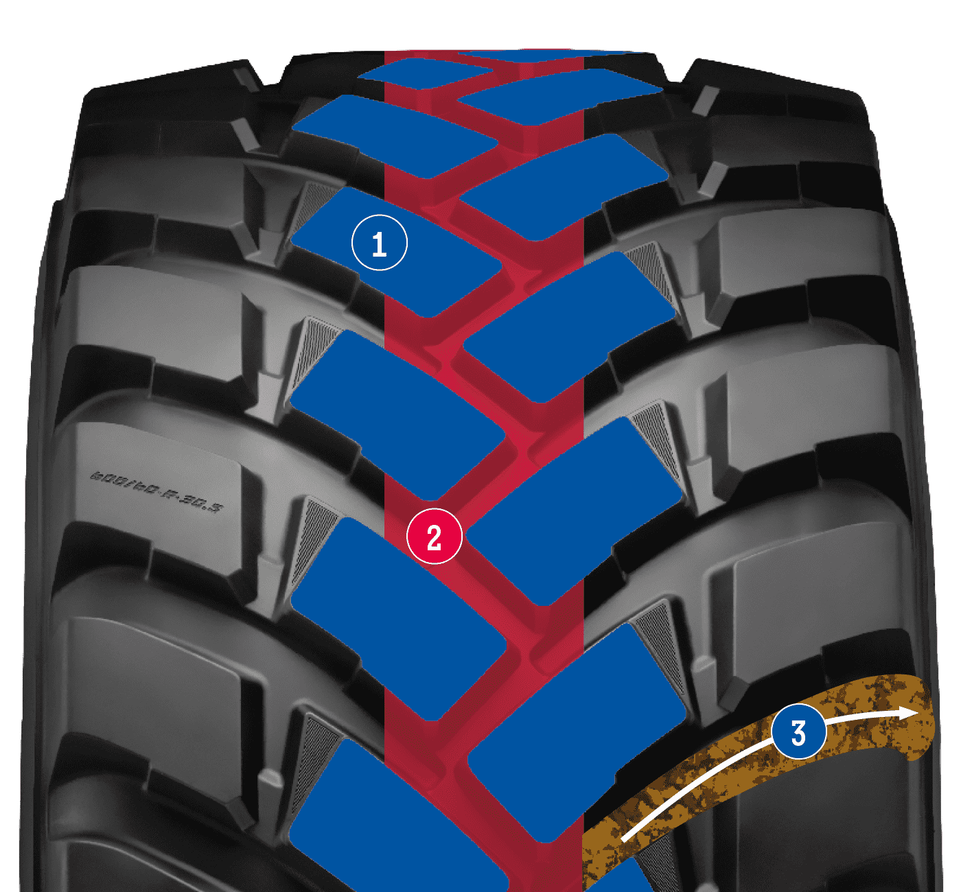 Unikke ikke-parallelle knopper med stadigt stigende afstand fra midten til skulderen giver fremragende selvrensende egenskaber. Dette sikrer konstant trækkraft selv under de vanskeligste forhold, hvilket sikrer optimal trækkraft og produktivitet.